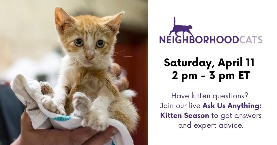 Do you have questions about kitten season? Mark your calendar for “Ask Us Anything: Kitten Season,” a Facebook Live conversation with Neighborhood Cats on April 11th from 2–3 pm ET. Susan and Bryan will share advice and answer questions about all things kitten, from trapping to socializing to general care. Be sure to RSVP so you receive a notification when we go live.